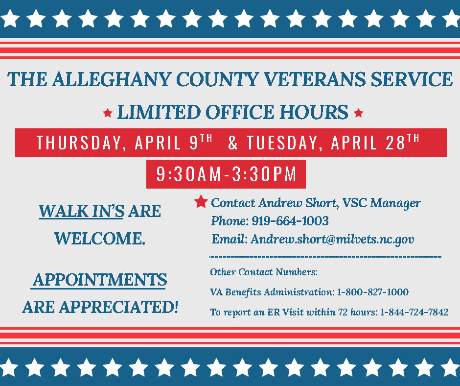 The Veterans Service Office advises local veterans and their dependents of their rights and entitlements under various Federal and State laws, counsels them, and actively assists them by filling out necessary forms and papers, obtaining documents and affidavits and forwarding the same to the North Carolina Department of Veterans Affairs for review and presentation before the US Veterans Administration.